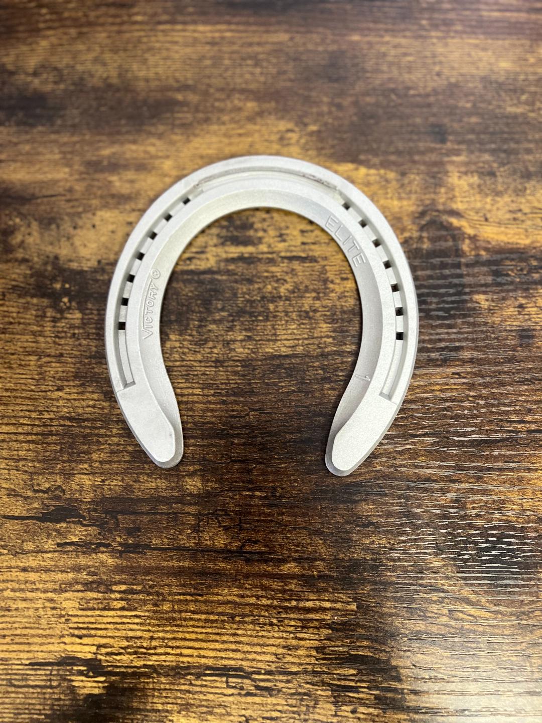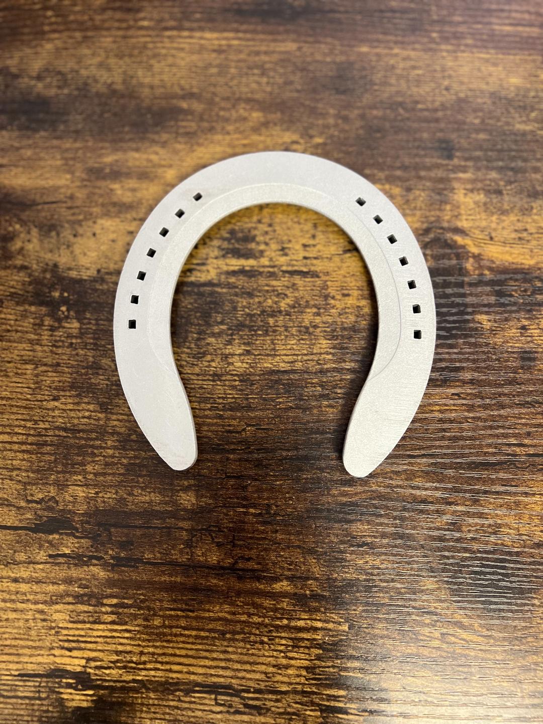 Shoe by Victory Racing Plate. Front pattern with steel wear insert is forged of lightweight aluminum. Designed for the sport horse, features include: wide web for support and protection; full swedge; wide, flat rims provide sure-footed traction on any surface; rugged durability; solid, flat heels can be drilled and tapped for studs; sole pressure relief.
